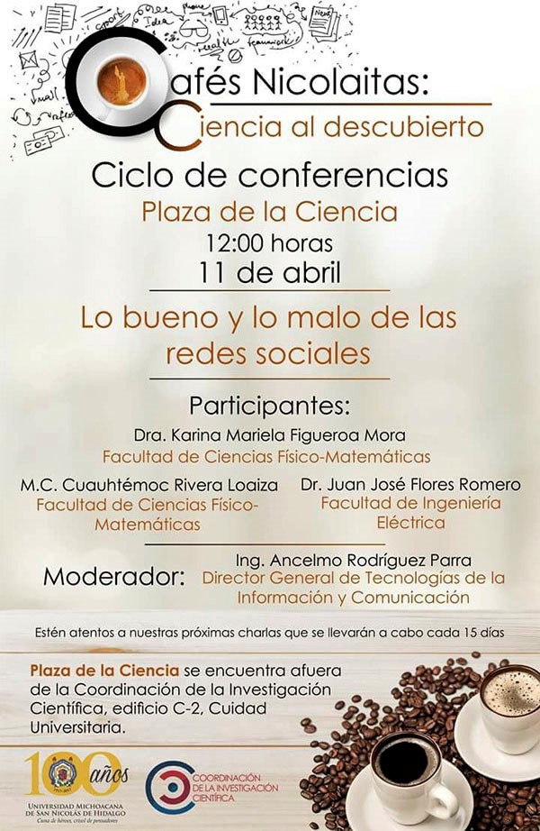 En continuidad con el programa de divulgación científica denominado: Cafés Nicolaitas: Ciencia al descubierto, esta semana la Universidad Michoacana de San Nicolás de Hidalgo presenta el tema “Lo bueno y lo malo de las redes sociales”.