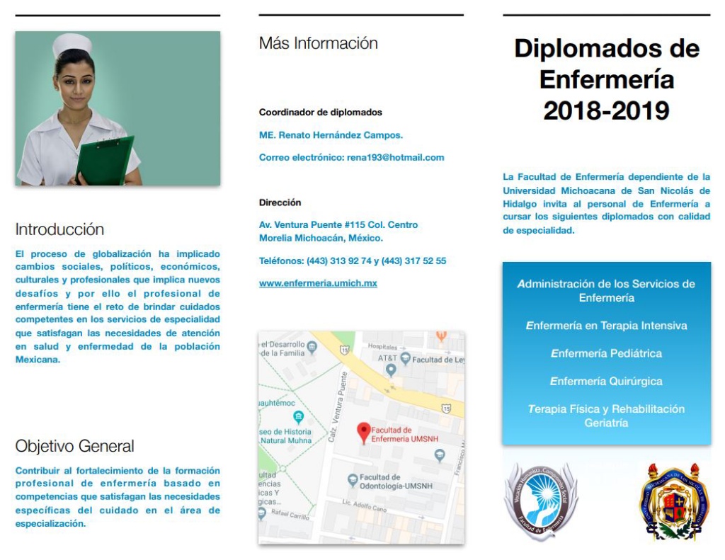 Ante el reto que implica brindar cuidados competentes en los servicios de especialidad, que satisfagan las necesidades de atención en salud y enfermedad de la población mexicana, la Facultad de Enfermería de la Universidad Michoacana de San Nicolás de Hidalgo, invita a la comunidad en el área a ingresar a sus Diplomados en Enfermería con calidad de Especialidad para el ciclo 2018-2019.