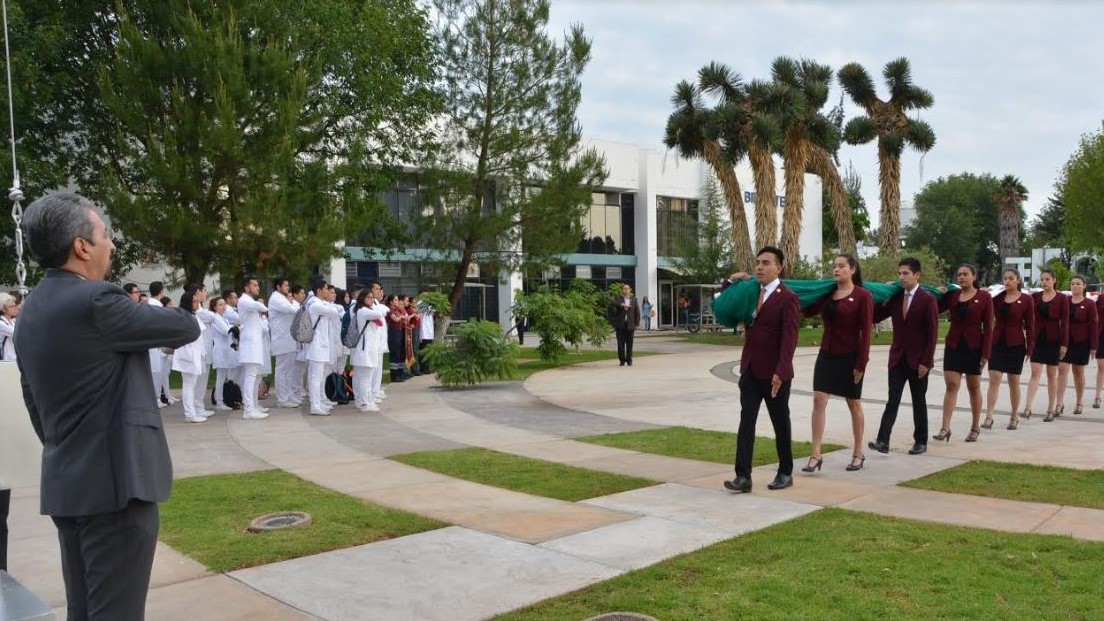 Rinde Facultad de Ciencias Médicas y Biológicas «Dr. Ignacio Chávez» honores a la Enseña Nacional.