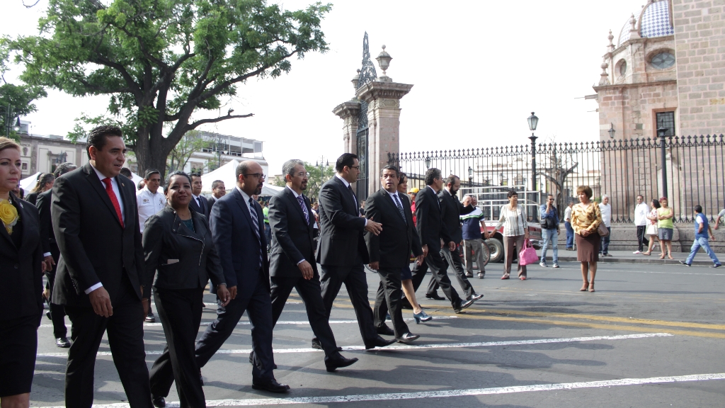 La comitiva, encabezada por la Banda de Guerra de la UMSNH, se trasladó a la Escuela Preparatoria Melchor Ocampo, en donde se montó otra guardia de honor, para luego emprender la marcha solemne rumbo a la Plaza Melchor Ocampo del Centro Histórico, precedidos de los estandartes y escoltas de las diferentes facultades e institutos de la Casa de Hidalgo.
