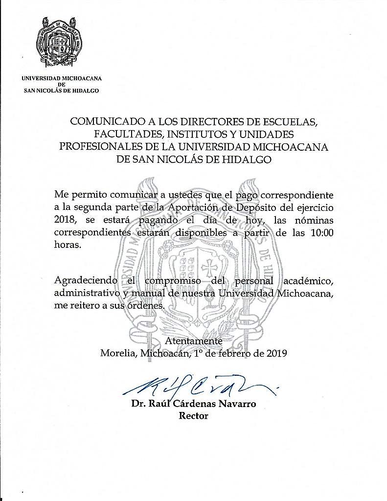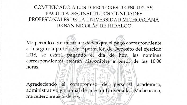 Gracias a las gestiones que realizó el rector de la Universidad Michoacana de San Nicolás de Hidalgo, Raúl Cárdenas Navarro, se realizó el pago de la segunda parte de las Aportaciones de Depósito del Ejercicio 2018 en las nóminas correspondientes de las y los trabajadores nicolaitas, que se adeudaban desde el pasado mes de agosto, gracias a recursos aportados por el Gobierno del Estado.