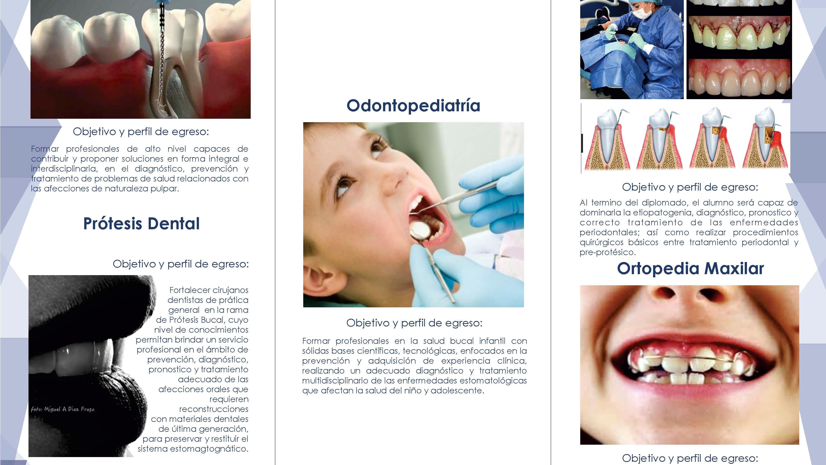 Los diplomados tienen una duración de doce meses, impartidos los días sábados en modalidad teórico-práctica en las siguientes áreas de especialización: Endodoncia, Prótesis dental, Odontopediatría, Periodoncia y Ortopedia maxilar.