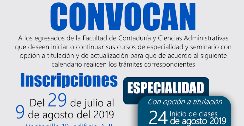 La Facultad de Contaduría y Ciencias Administrativas de la Universidad Michoacana de San Nicolás de Hidalgo convoca a los egresados de la institución, a realizar los trámites correspondientes para iniciar o continuar con sus cursos de especialidad y seminario con opción a titulación y de actualización, que se impartirán en agosto.