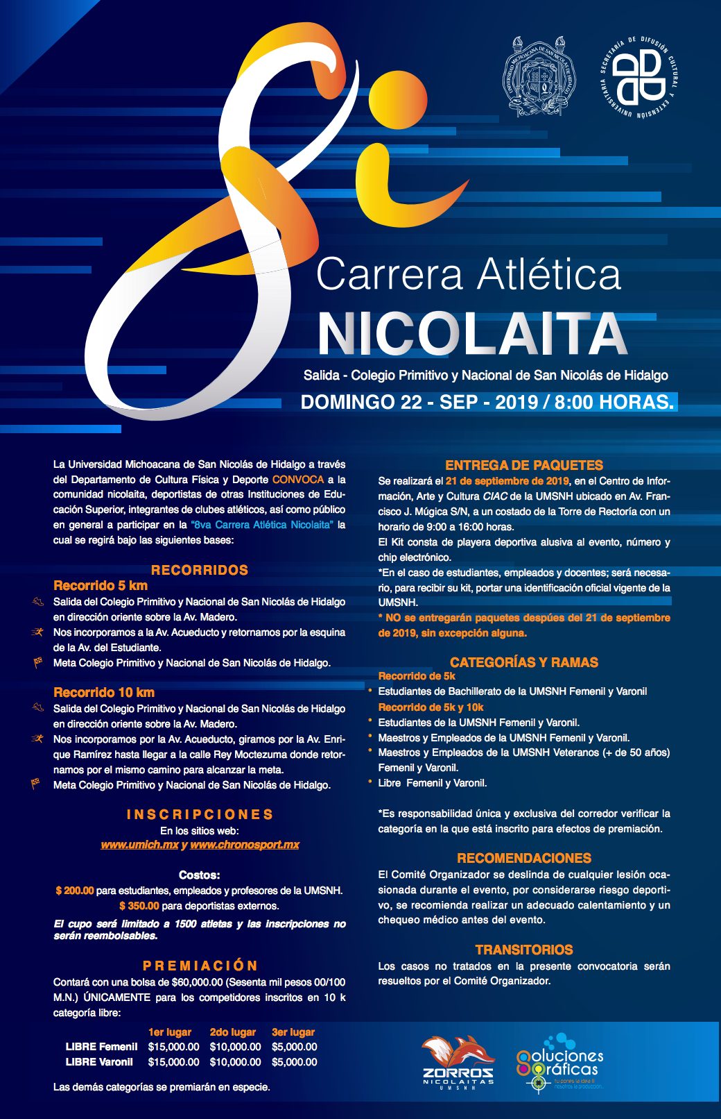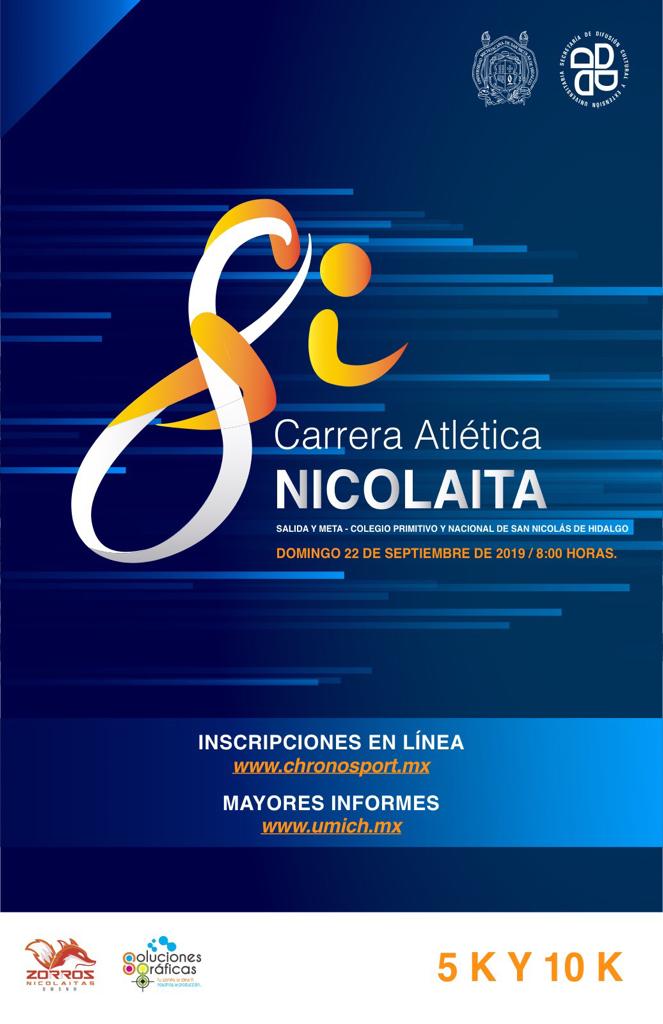 Continúan abiertas las inscripciones para la 8ª Carrera Atlética Nicolaita, que organiza la Universidad Michoacana de San Nicolás de Hidalgo, a través del Departamento de Cultura Física y Deporte, y que se llevará a cabo el domingo 22 de septiembre.