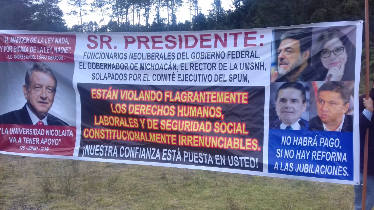 Durante la gira del presidente de la república en tierras michoacanas, -realizada este sábado en los Azufres-, integrantes del Sindicato de Profesores de la Universidad Michoacana, asi como del Sindicato Unico de Empleados de la Universidad Michoacana, realizaron un protesta simbólica durante el paso del convoy del presidente Andrés Manuel López Obrador, al cual le entregaron una solicitud de audiencia, en protesta para la falta de pago de salarios y prestaciones asi como de la negativa a la propuesta final de jubilaciones y Pensiones en la Universidad Michoacana, entregada por autoridades universitarias.