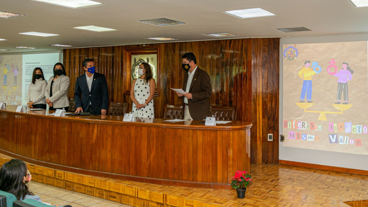 El rector de la Universidad Michoacana de San Nicolás de Hidalgo (UMSNH), Raúl Cárdenas Navarro, entregó esta mañana los premios a los ganadores del Primer Concurso de carteles, memes y stickers que se realizó para promover la igualdad de género entre la comunidad universitaria; los diseños ganadores formarán parte de la próxima campaña institucional.