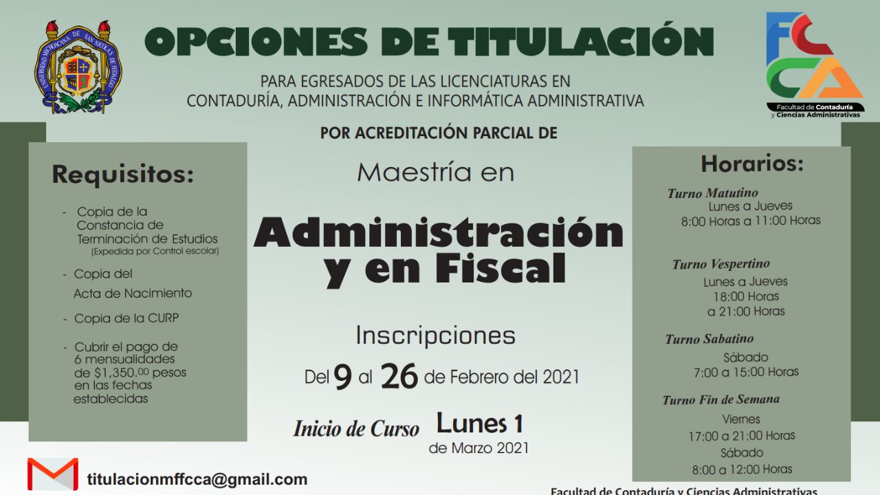 Para mayor información consulta la División de Estudios de Posgrado de la Facultad de Contaduría y Ciencias Administrativas, ubicada en el tercer piso del edificio A-4 en ciudad universitaria de la UMSNH, en administración con la Lic. Claudia Cázarez Huante, y en Fiscal con Susana Vertiz, a los teléfonos 4433167411, 4432994370 y 4433223500 extensión 3128, o a los correos electrónicos mffccamorelia@gmail.com o posgradofccamamf@gmail.com