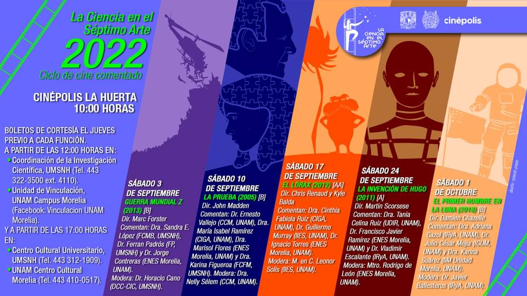 La Universidad Nacional Autónoma de México a través del instituto de radioastronomía y astrofísica la universidad Michoacana de San Nicolás de Hidalgo a través del departamento de comunicación de la ciencia de la coordinación de la investigación científica y la empresa Cinépolis convocan a la población Michoacana la realización de su edición 2022 del ciclo de cine comentado La Ciencia en el Séptimo Arte que se realizará del día sábado 3 de septiembre del año en curso hasta el sábado primero de octubre. a partir de las 10 de la mañana en las instalaciones del complejo Cinépolis La huerta de la ciudad de Morelia.