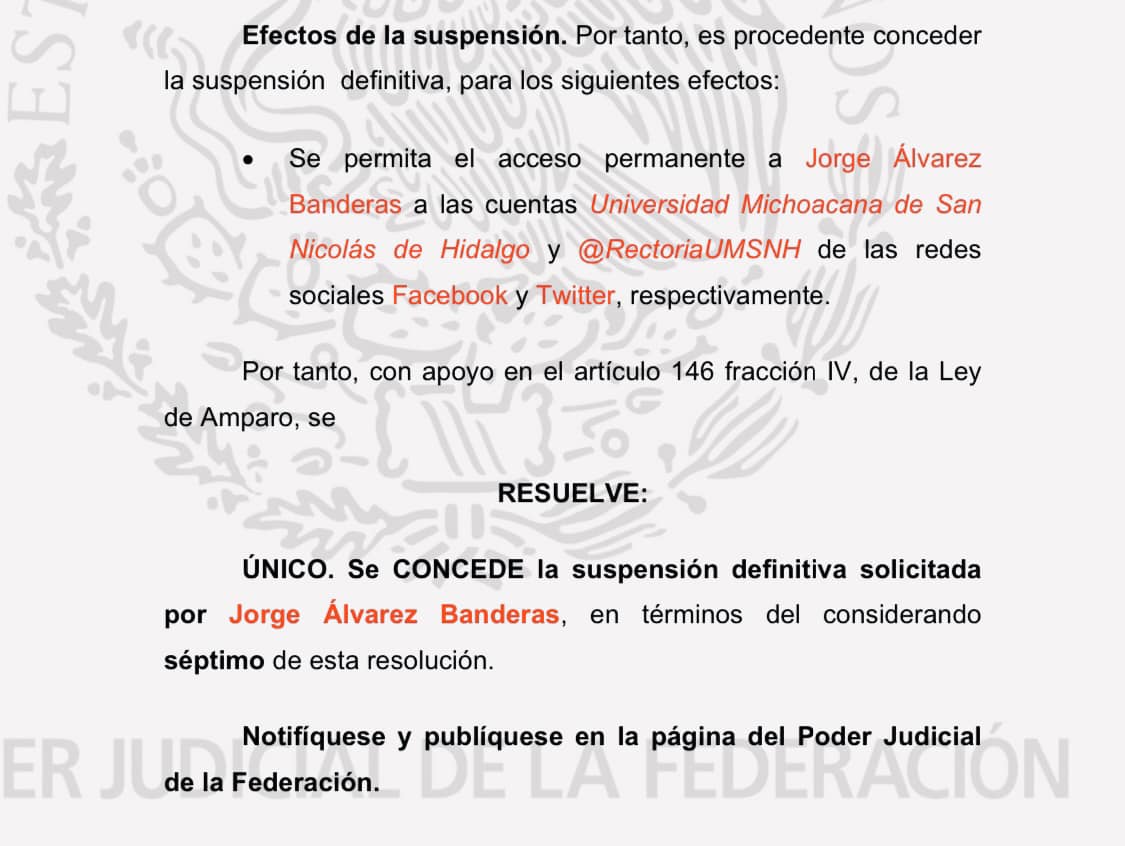Los efectos de la suspensión definitiva otorgada, señala: «Se permite el acceso permanente a Jorge Álvarez Banderas a las cuentas Universidad Michoacana de San Nicolás de Hidalgo y @RectoríaUMSNH de las redes sociales Facebook y Twitter, respectivamente»