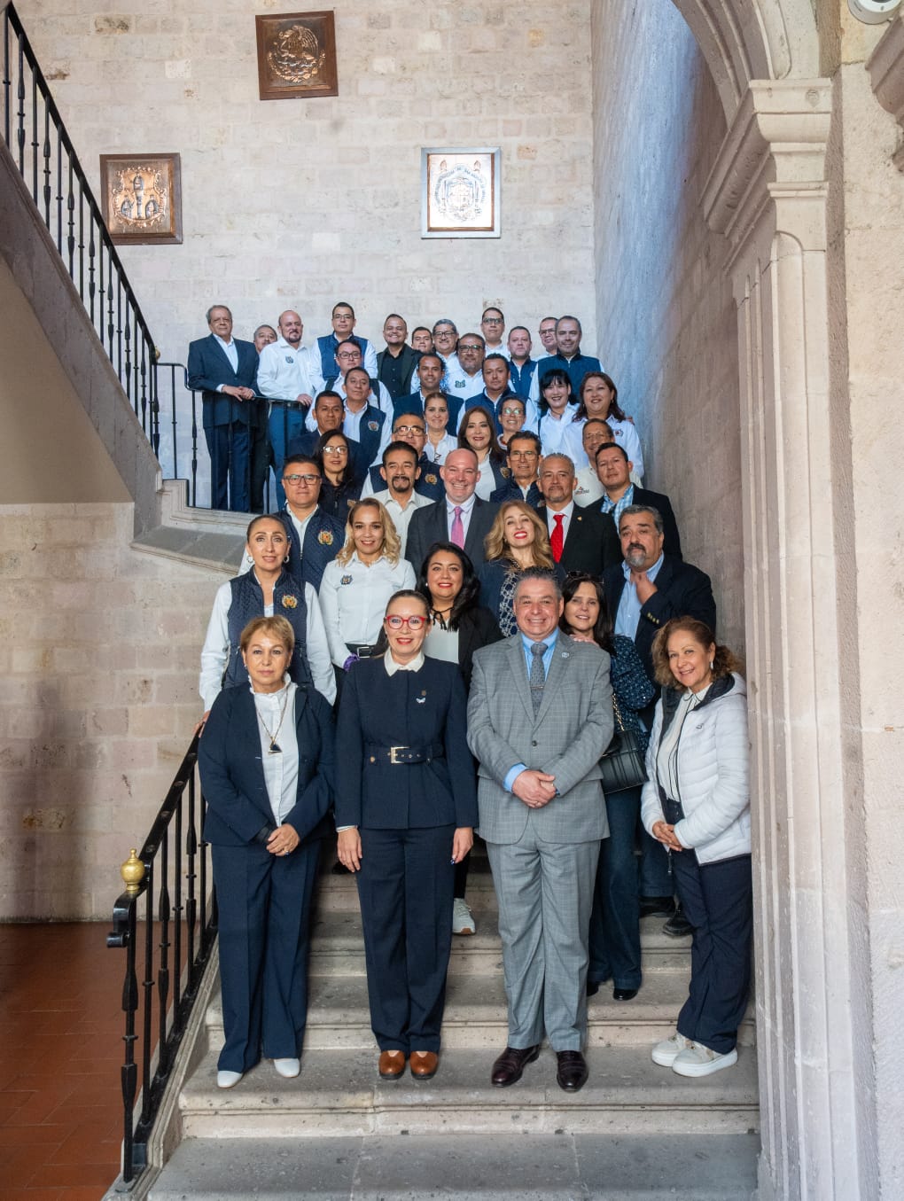 La rectora Yarabí Ávila González y el presidente de Saint Peter's University, Hubert Benitez, posan junto a funcionarios de ambas instituciones en las instalaciones históricas de la Casa de Hidalgo, en Morelia.