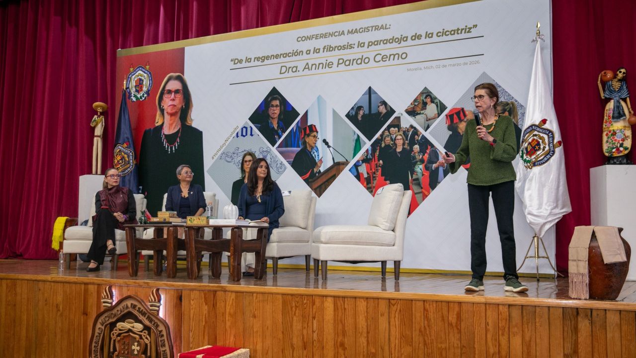 Ante un auditorio repleto de estudiantes de la Universidad Michoacana de San Nicolás de Hidalgo (UMSNH), la doctora Annie Pardo Cemo, reconocida científica mexicana de alcance mundial, dictó la conferencia magistral «De la regeneración a la fibrosis: La paradoja de la cicatriz», en la que incentivó a las y los alumnos nicolaitas a convertirse en los futuros investigadores e investigadoras del país.}